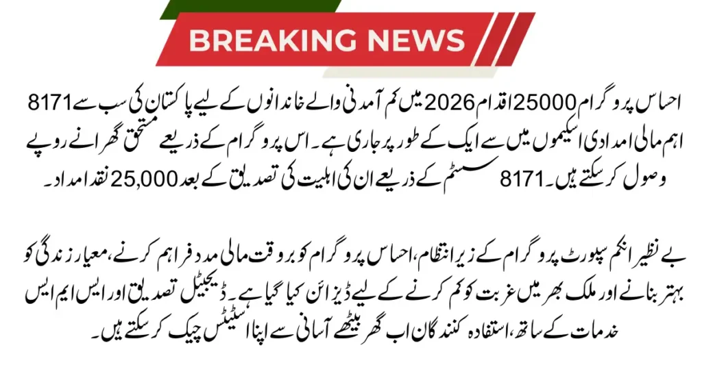 The 8171 Ehsaas Program 25000 remains a crucial support system for millions of Pakistani families in 2026. By using your CNIC through the 8171 system, you can quickly verify eligibility, track payments, and ensure your household receives the financial assistance it deserves.